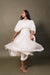 Ivory dress in self-lined fabric, featuring elegant cape sleeves, button accents on the bodice, and a pleated skirt for a sophisticated, structured silhouette.